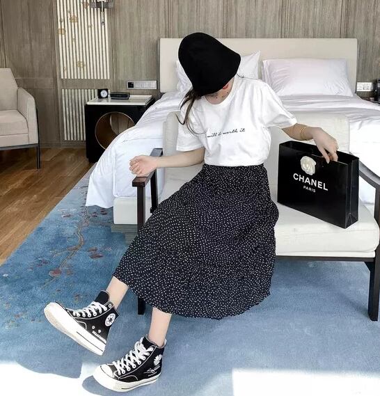 小さなロゴ入りのTシャツです。ロゴはポイントながらも目立たないのでコーディネートの邪魔をしません◎