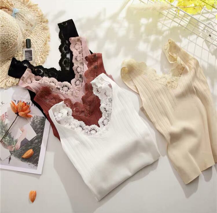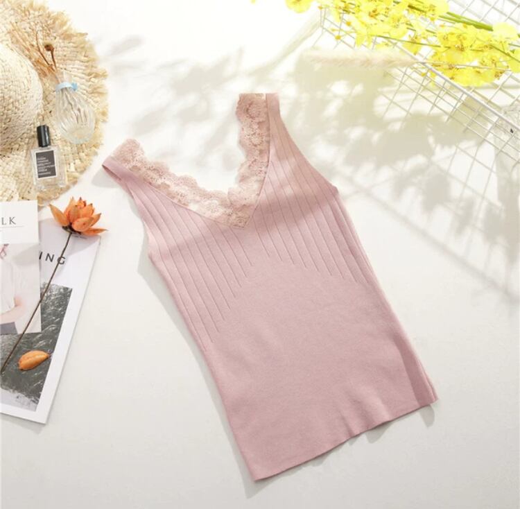 上品なレースのついた可愛らしいニットキャミです。着回しがきくので色々なシーンで役立ちます!